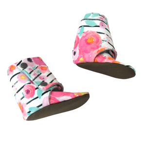 These striped floral are the perfect accessory for any outfit! They are made with durable, water-resistant recycled canvas which contains 45% recycled content. (These boots are made from recycled water bottles!) The upper ankle wrap is lined with soft, grey fleece, and the foot is lined with breathable cotton flannel.