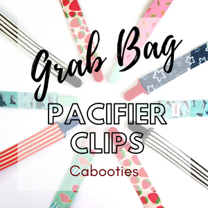 Treat yourself to a surprise pacifier clip from our grab bag! The prints found in our grab bag are past, present, or future options that can't be currently be purchased on our site. CPSIA complaint, please do not leave your baby unattended with this product.  Due to the nature of this product we are unable to accept returns on grab bag items.