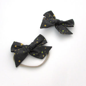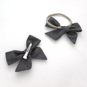 Please choose from nude nylon headband or an alligator clip. Bows on alligator clips will not come glued to the clip. This is to allow you to switch sides depending on how your love wears their hair by sliding the clip out from the back of the knot and placing it on the side of your choice.