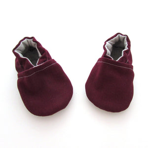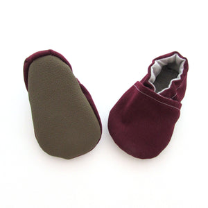 Keep tiny toes safe and cozy in our Burgundy Brushed Denim moccs. Made of heavy-duty brushed denim, soft flannel, and flexible rubber, the thin and flexible construction of this handmade, vegan baby shoe lets little feet move naturally, making it ideal for transitioning from crawling to first steps! Cabooties move and bend with the foot, providing excellent freedom of motion to encourage natural steps and a confident sense of balance.