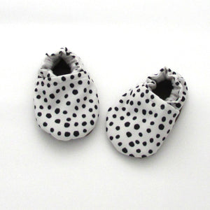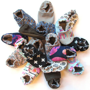 As with all Cabooties, our grab bag shoes have elastic around the ankle which makes them easy to put on but difficult for babies to kick off. The soft flannel lining makes them super comfortable for little feet, and flexible rubber soles allow tiny toes to flex and grip the ground.
