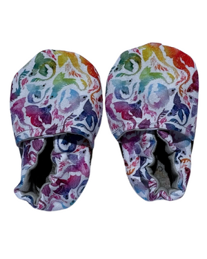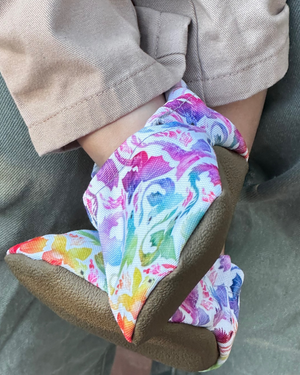 Perfect baby and toddler shoes for your little one on the go. The unique grippy soles provide the traction and stability your little one needs as they learn to walk with confidence. Shoes are lined with cotton flannel, perfect for wear with or without socks. Gentle ankle elastic will keep shoes on the most active kickers and crawlers. Handmade in Pennsylvania and North Carolina.