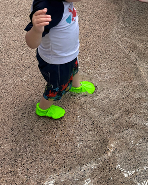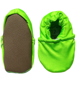 Protect tiny toes poolside with these adorable shoes that actually stay on! Soft swim lining and ankle elastic make these the perfect newborn shoe, and the unique grippy soles provide the traction and stability your little one needs as they learn to walk on wet ground with confidence. Shoes are lined with swim fabric, perfect for wear at the beach, pool, puddle jumping, or every day. Gentle ankle elastic will keep shoes on the most active kickers and crawlers.