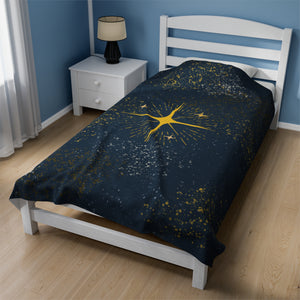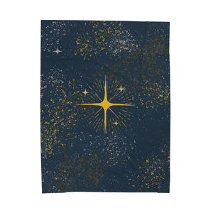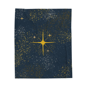 Cozy velveteen plush blanket featuring a design of gold and silver stars on a dark blue background, with a bright gold North Star in the center. Perfect for holiday snuggling by the fire, this blanket adds a touch of celestial magic to any room. Ideal for stargazers, astronomy enthusiasts, and those who love to cozy up during the colder months.